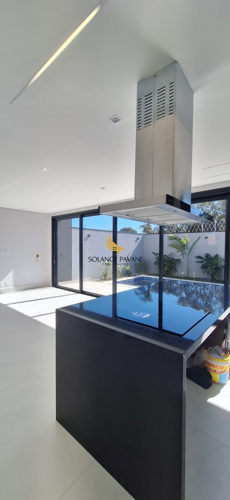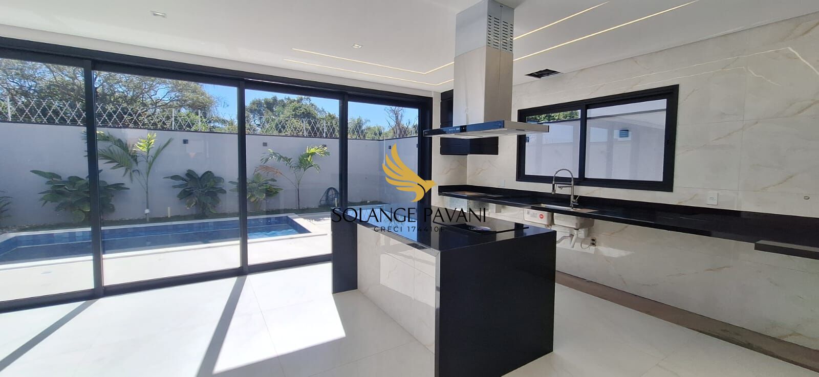 Sala de estar e jantar com pé direito alto e ótima iluminação natural, integradas com a cozinha e a área gourmet, e o quintal com uma bela piscina. A casa também conta cozinha com cooktop e coifa, lavabo, lavanderia, depósito e entrada lateral pela garagem, garantindo praticidade no dia a dia. A garagem comporta até quatro veículos, sendo duas vagas cobertas.